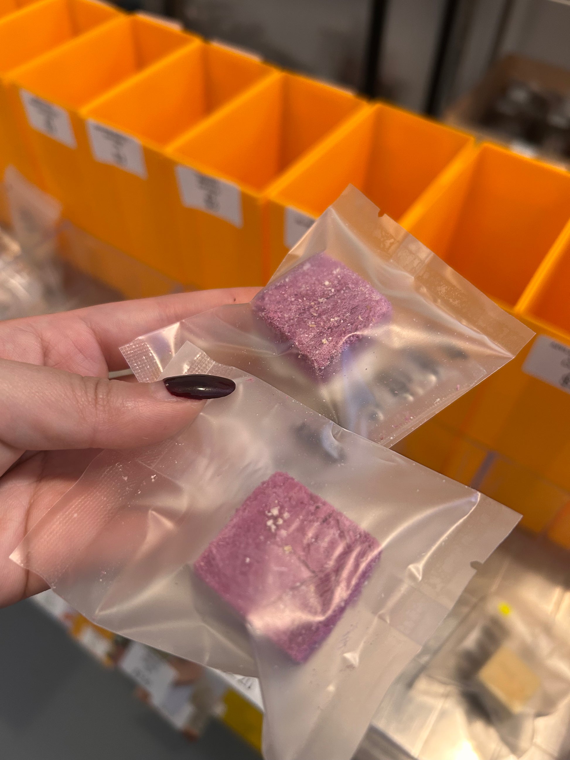 Freeze dried cranberries blended with tofu on a apple, oat, wheatgerm base