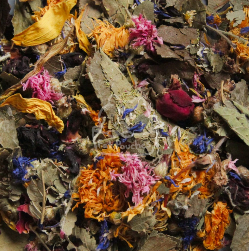Crunchy apple leaves, green oats, rose petals, cornflowers, mallow chamomile, sunflower petals and marigold