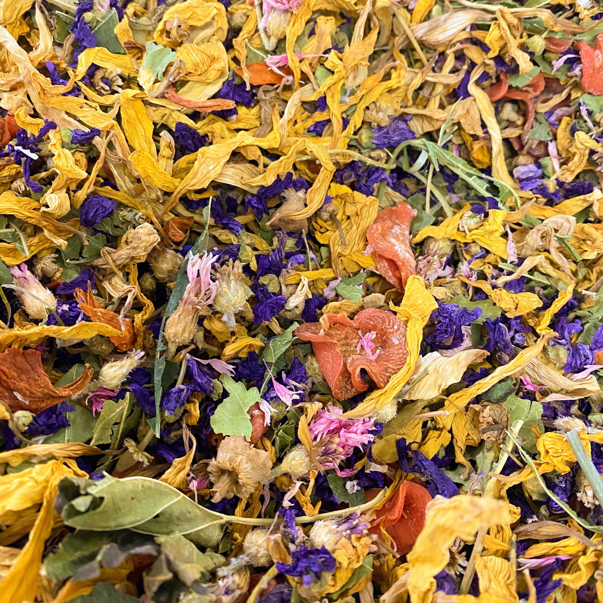 Immune system boosting flower blend. Includes mallow, sunflower petals, chamomile, mulberry leaves, daylily, cornflowers, carrot slices