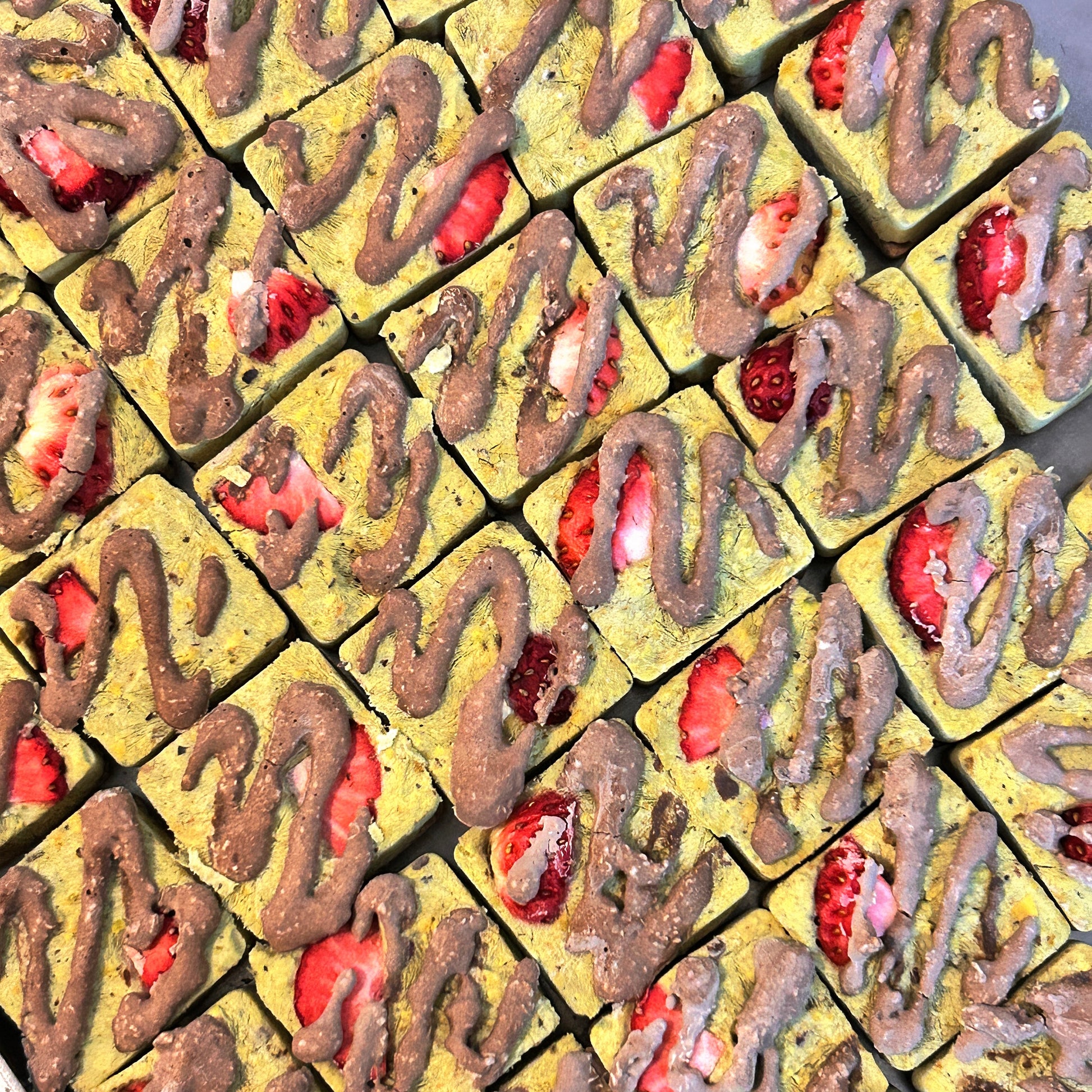 Freeze dried spinach and pistachios blended with tofu on a apple, oat, wheatgerm, carob base. With a carob and goat milk drizzle and garnished with a strawberry chunk!