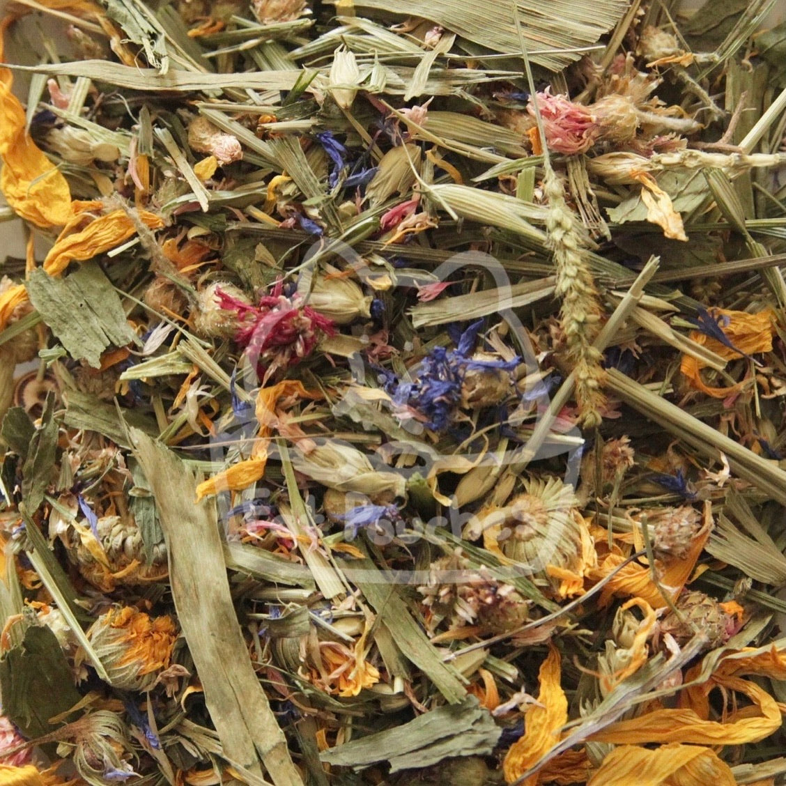 Includes : green oats, green wheat, marigolds, plantain, pink and blue cornflowers, sunflower blossoms
