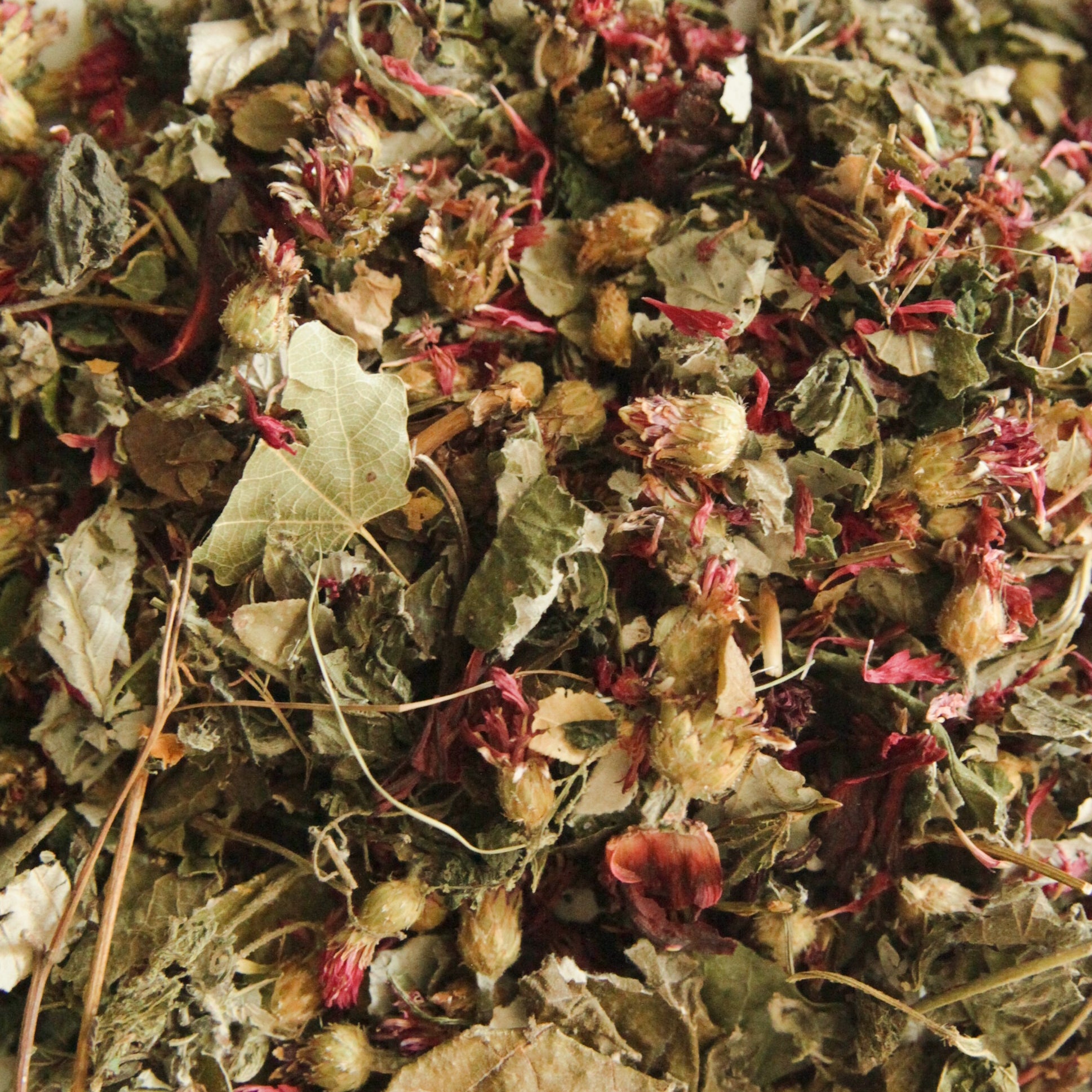pink cornflowers, red cornflowers, raspberry leaves, hazelnut leaves, dandelion leaves, hibiscus flowers