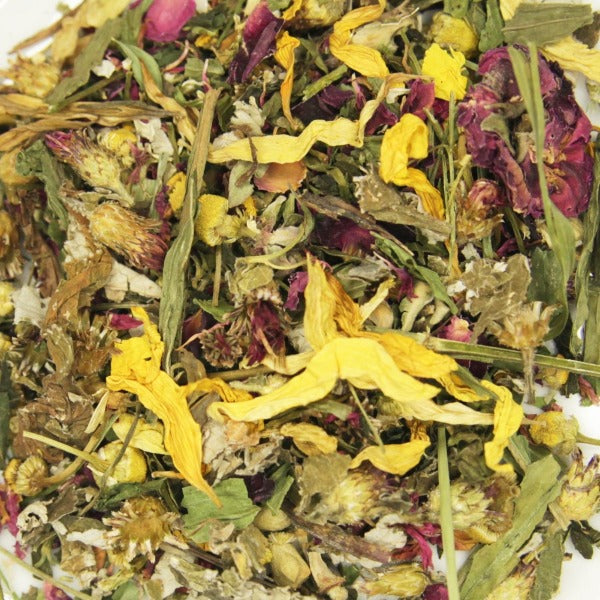 Chamomile, pink cornflower, rose petals, raspberry leaves, parsley stalks, dandelions, plantain, nettle, sunflower.